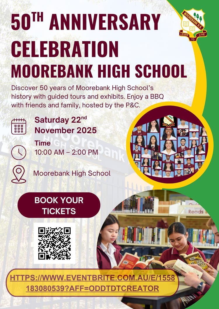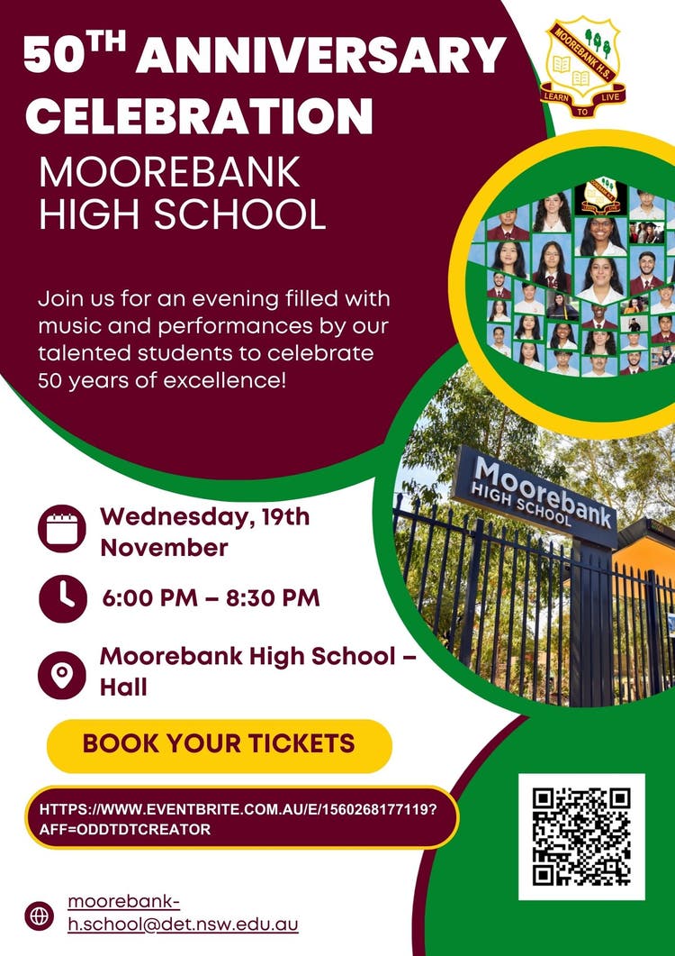 Enjoy an evening filled with music and performances by our talented students celebrating 50 years of Moorebank High School. 50th Anniversary Evening Concert 2.5 Mb PDF.